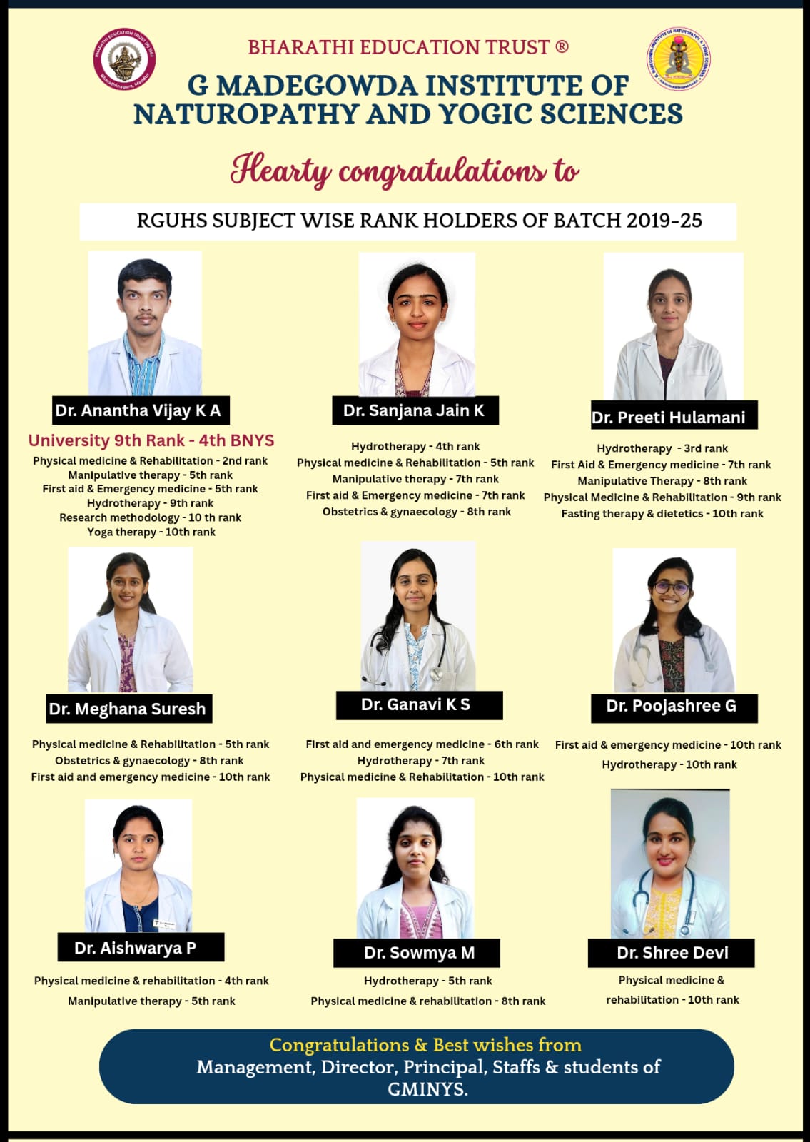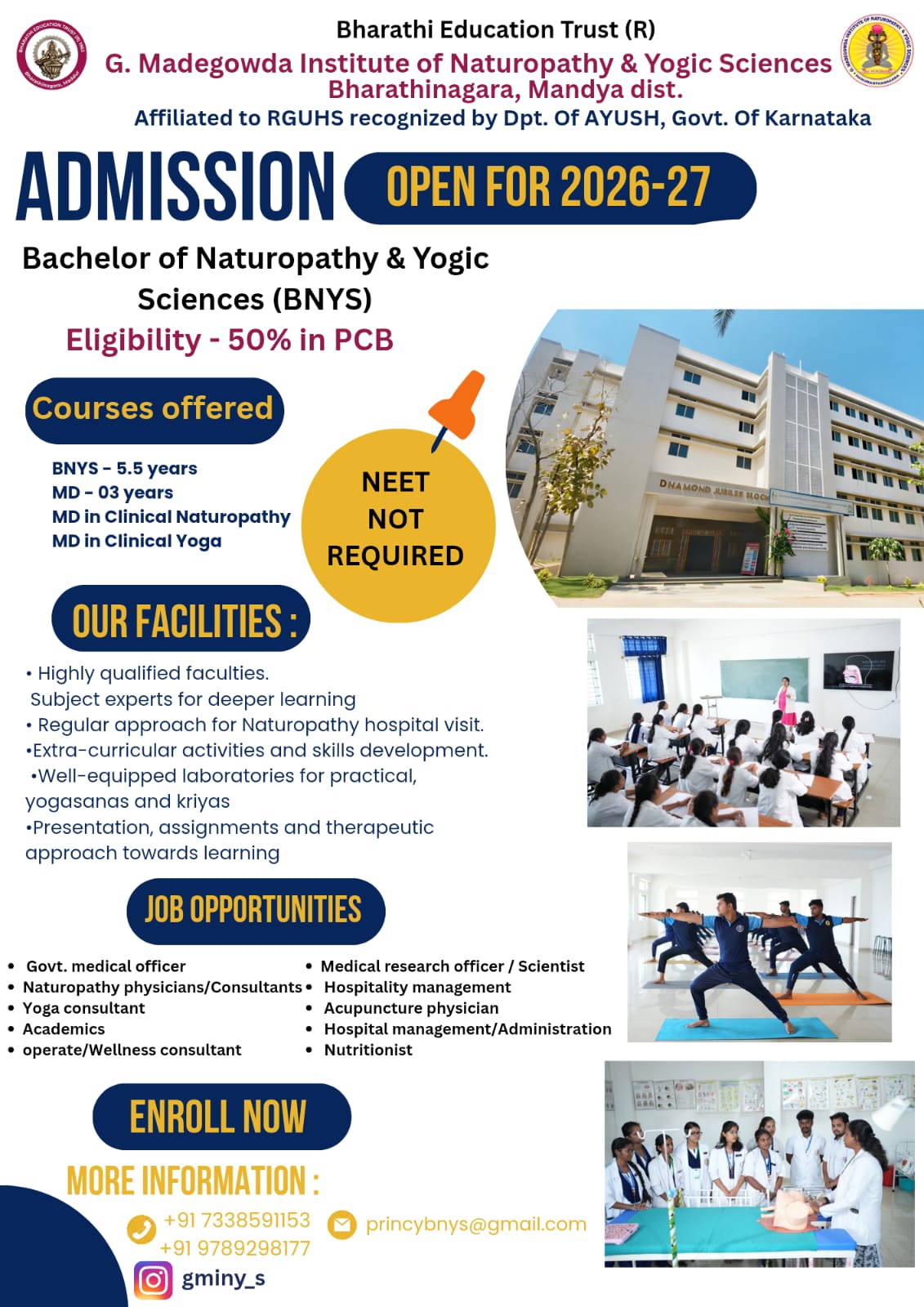 GMINYS was established in 2018 by BHARATI EDUCATION TRUST(R) in Bharatinagara, Mandya. The college offers a 5-and-a-half-year BNYS (Bachelor of Naturopathy and Yogic Sciences) Medical Degree Course, which is affiliated with Rajiv Gandhi University of Health Sciences and recognized by the Government of Karnataka and the Government of India. The BNYS program entails four and a half years of regular study, followed by a compulsory rotatory internship for one year. The college has an intake capacity of 40 students every year. Presently, students from various states of India are enrolled in this institution. The program offered by the college combines the knowledge of modern medical systems with the traditional healing science of naturopathy and yoga. The college promises to provide diverse opportunities for the holistic development of each student.